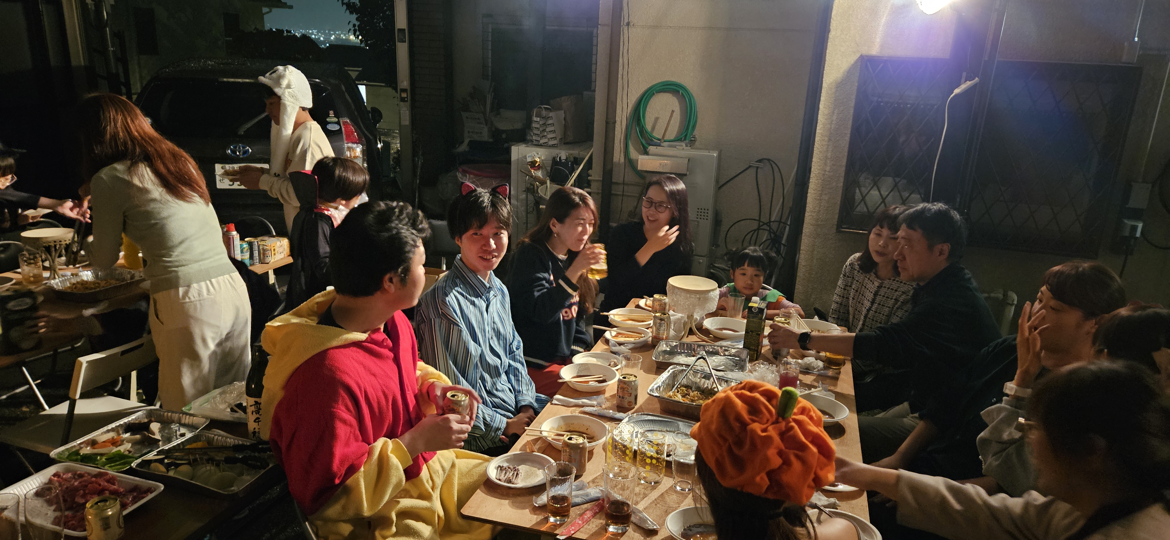 夕刻から予定していたメインガーデンでのハロウィン祭りは、あいにくの荒天のため、急遽、裏庭のガレージスペースを利用してのバーベキュースタイルに変更💦